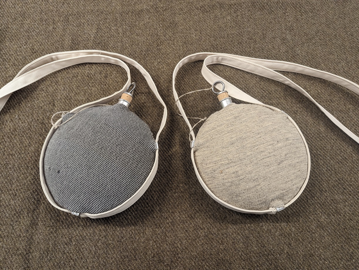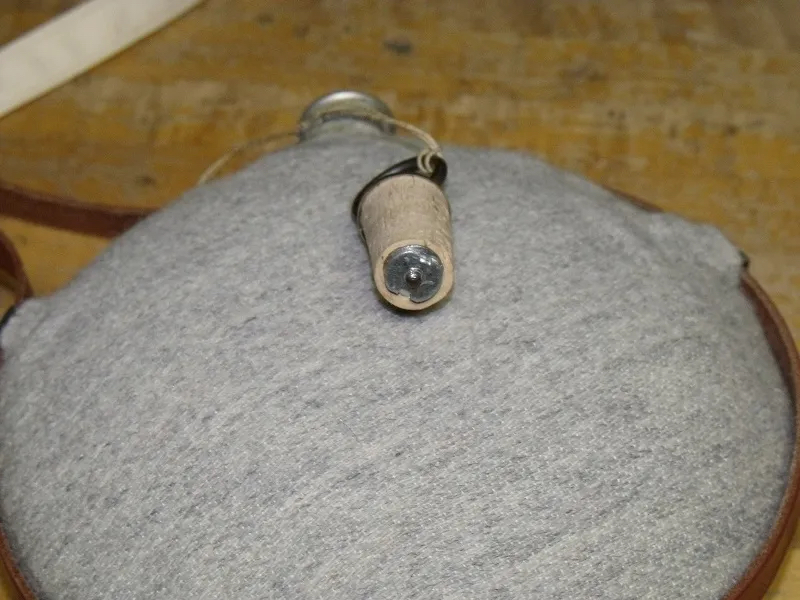 Canteen of the type issued in the hundreds of thousands by the Cincinnati depot to soldiers throughout the western theater. Canteens from this depot were typified by a tin spout, and plain weave cotton or linen strap. The stopper is a custom made short cork with a square nut and domed tin washer. Our canteens are covered in a variety of jeans and are lined in beeswax.