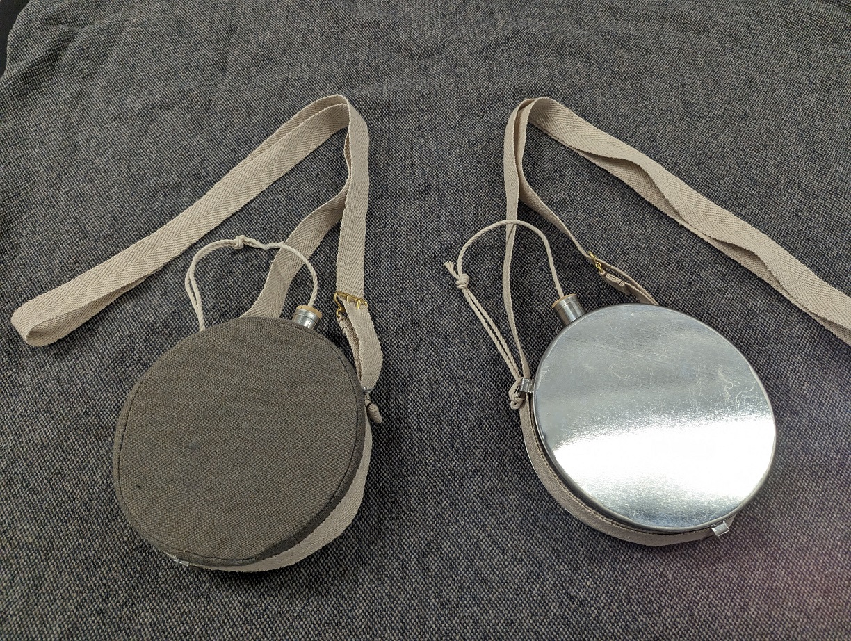 American made tin drum canteen made with hot dipped tin, let plain or covered in jean cloth for an additional fee (left loose to allow for shrinkage.) Simple cork stopper with cotton cording. Hand sewn strap made from custom made FHW cotton webbing.