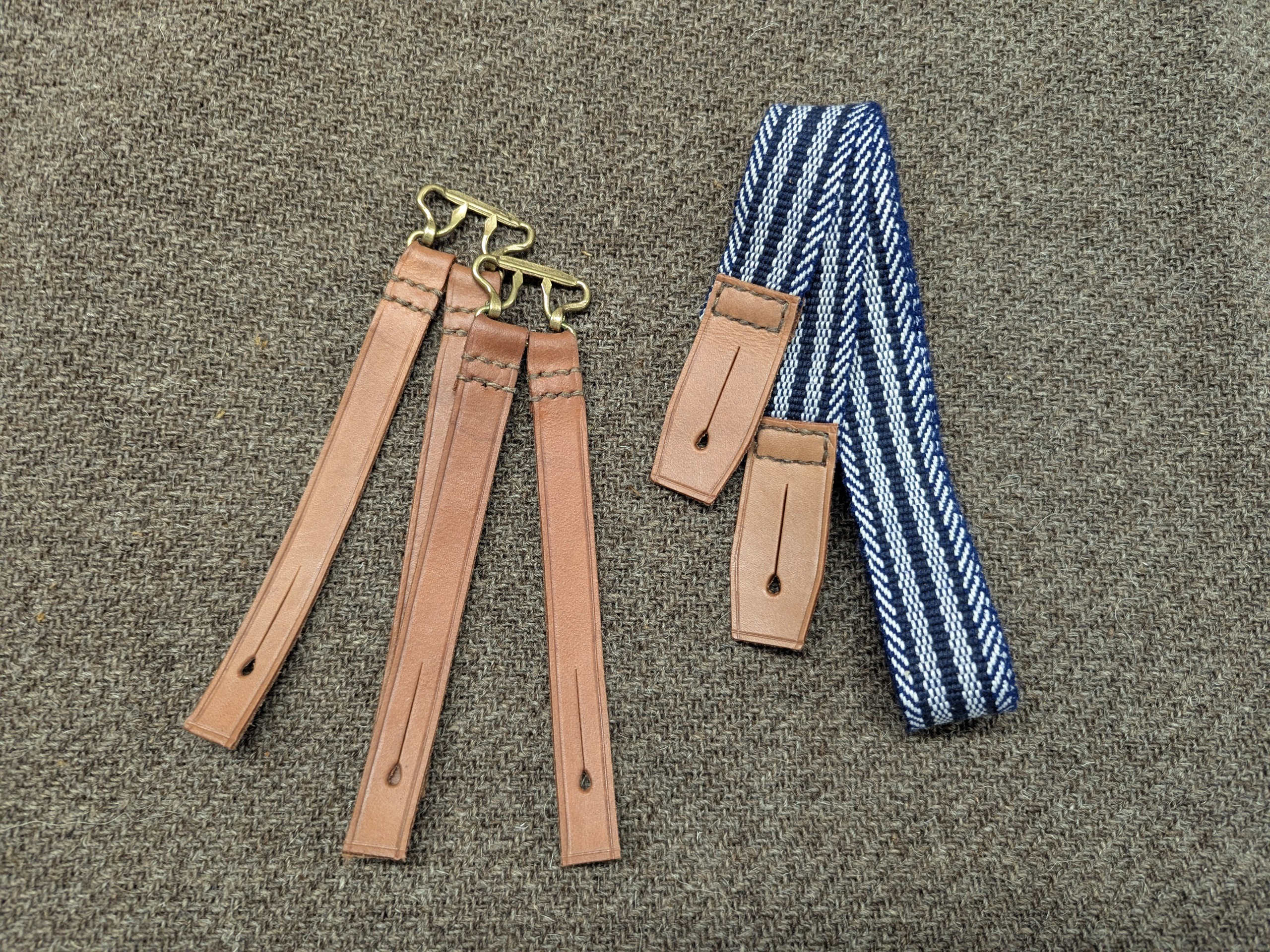 Suspenders made from a variety of worsted wool and cotton webbing woven by FHW and finished with hand sewn leather end tabs and risers. A handsome yet utilitarian upgrade over our standard folded cloth suspenders. Webbing supplies are finite so order yours now!