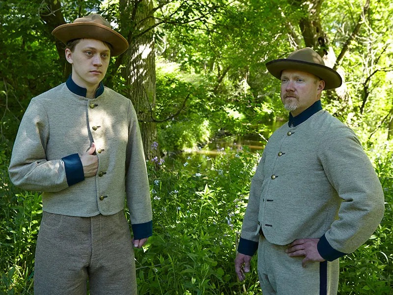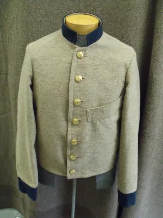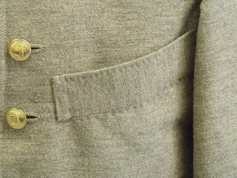 In his survey of Confederate jackets, Les Jensen identified two types of jacket produced by the Columbus Depot, the primary difference between these being the exterior pockets found on the “Type II” jackets. Though photographic evidence suggests that “Type I” jackets continued to be worn throughout the war, the “Type II” jackets are more commonly attributed to the mid to late war period. Based on the Private Randolph jacket, our reproductions utilize only the best materials and construction features to give as accurate a reproduction of this jacket as possible. The jackets can be made from your choice of jean, and are lined in cotton osnaburg. They feature a large welted exterior pocket. The trim is made from old stock Family Heirloom Weavers wool kersey, which is the correct weight, weave, and color to match the original jacket. The jackets have a seven button front with superb script “I” buttons made by Ben Tart. No corner has been cut on our jackets, only the best materials and craftsmanship are used, and make these some of the best Columbus Depot jackets produced since the war!
