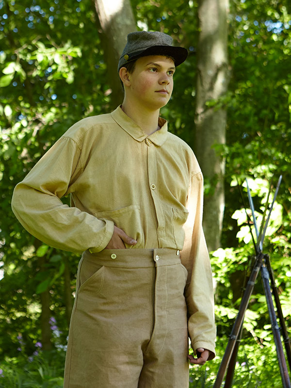 Patterned from an original shirt worn by Englishman Charles A. Parkins who served in the Confederate army, and was later made part of the Don Troiani collection. Now known among the living history community as the "Louisiana shirt", variations of this shirt have easily been one of the most popular CS issue undergarments among living historians for many years. Our kits will have one notable difference in their appearance, and that is the material from which they are made. The original shirt is made from a very narrow 27" wide striped cotton material, and the side seams and vents utilize the selvage and makes for an easy and speedy assembly. Unfortunately the original shirt utilizes no fewer than four different stripe patterns, making exact replication a ridiculously difficult and cost-prohibitive venture! As a result, our kits feature an excellent cotton osnaburg which will give you a versatile and authentic CS issue shirt appropriate for just about any impression! The pattern of the original shirt is very simple to assemble, with no sleeve gusset, a plain, rolled cuff, and no buttonhole placket, yet the curved arm-scye and healthy cut allow for an absolute maximum of comfort! The shirt also features two exterior patch pockets, placed unusually low to allow for ease of access, and is closed by four bone buttons. Kits will be available in medium (up to a size 42,) large (up to a size 48,) and for $5.00 more extra large (up to a size 52,) though bear in mind these shirts are cut very full and will fit several sizes larger!