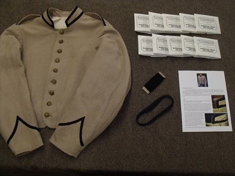 With this kit you can add trim to your favorite CS jacket, making your plain jacket really stand out at those early war events! Have a Richmond Depot Type II and need a Type I for a couple of events, but don't want to pay for an entirely new jacket? This kit contains more than enough tape to trim a collar, epaulets, and cuffs! Each kit contains: -Three yards tape in the color of your choice. -Matching thread to sew the tape into place. -Full color instructions on how to apply the trim. -A template for the cuff chevron.