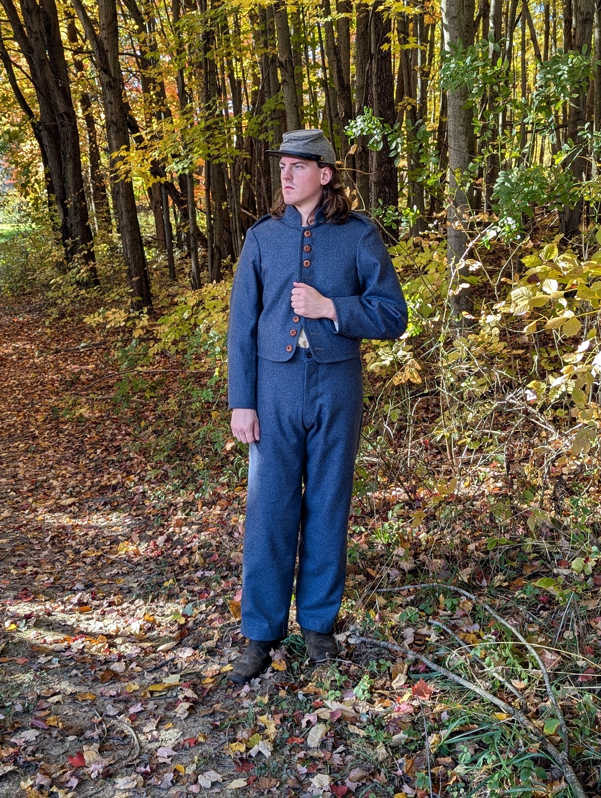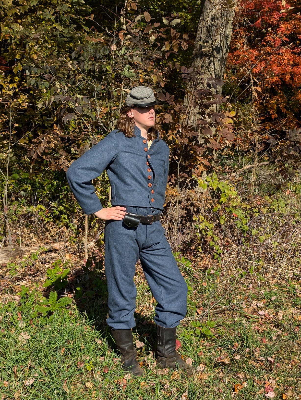 Beginning in January 1862 the confederacy began receiving shipments of wool army fabric from Europe. As the war progressed southern production became ever-increasingly dependent on these foreign-produced fabrics to supplement, then supersede dwindling domestic woolen yard goods production. By the summer of 1863, the ANV began seeing its first large-scale issuances of clothing made in Richmond but produced using imported English woolens, and by the advent of the Overland campaign in 1864 most of the army was wearing some sort of article of clothing made from imported fabrics. While a sizable variety of different fabrics were imported the most common was "English Army Cloth", a twill-woven kersey made from a three-color wool blend and originally used to produce overcoats for the British army. Our reproduction English army cloth is a 59" wide 18oz 100% wool three-colored blend twill woven kersey. It is finely woven with a soft hand and a medium nap finish.