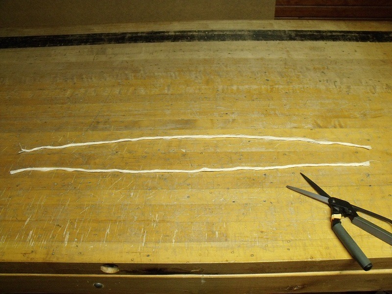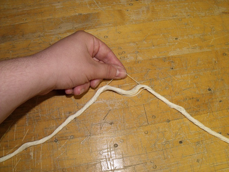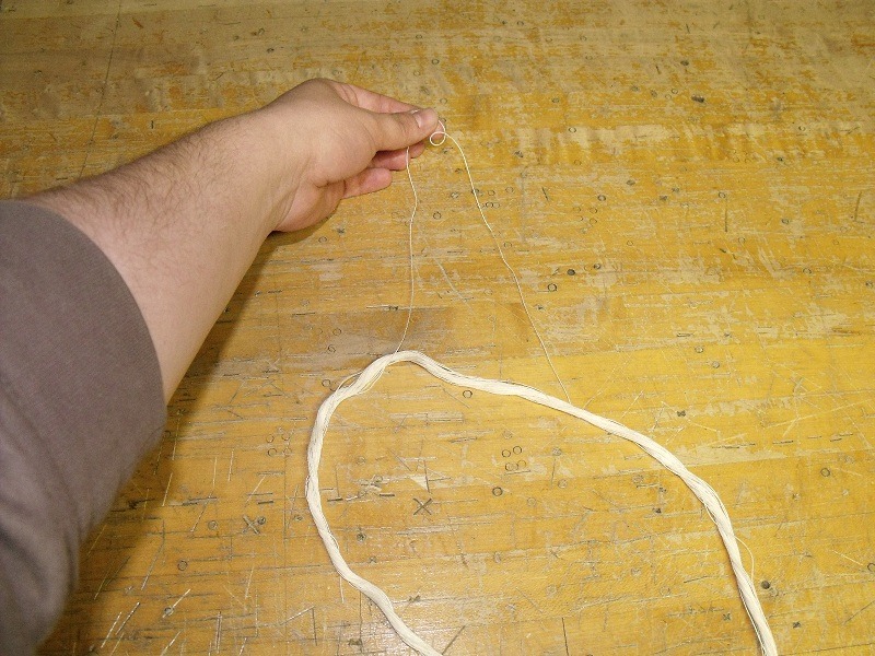 Step 3: Clip the thread at one end. This will make perfect 1 3/4 yard lengths of thread, which is a good length for sewing buttonholes. Pull out 10-15 of these threads and set them aside. Then cut the skein in half again to give you shorter lengths that are approximately the length of your arm (the exact amount you want to sew with each time.)