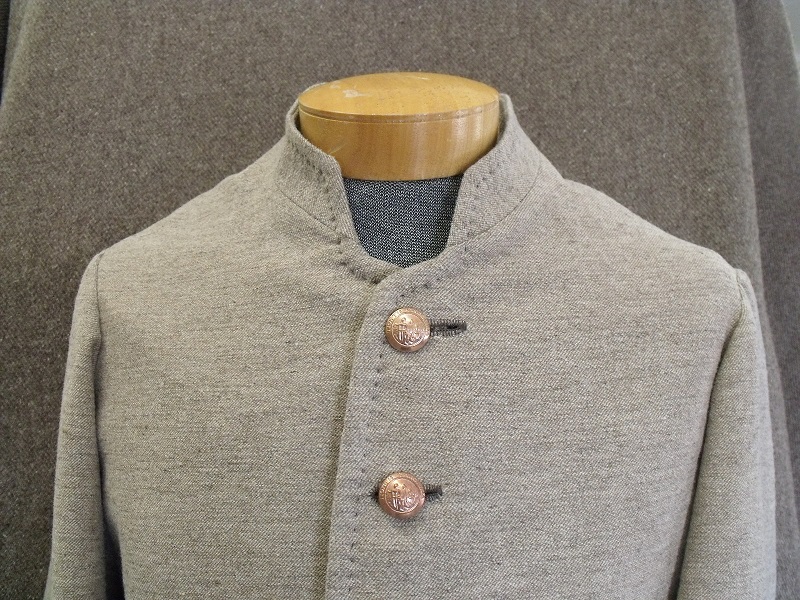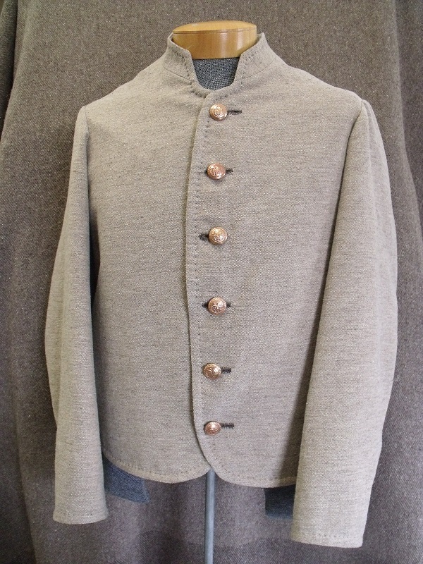 The state of North Carolina produced tens of thousands of uniform items for its troops serving in various theaters of the war. By employing its own purchasing agents overseas and keeping the port of Wilmington open until the final months of the war the state was able to augment its domestic textile production and did argueably the best job of any southern state of supplying its soldiers. In fact, in the final months of the war the state issued a large number of its surplus uniforms to the Army of Tennessee as it pursued Sherman. Based on the Private John B. MacRae jacket, our reproduction features the same simple, hasty construction of the original. The jacket features a four-piece body and one piece sleeve, cotton osnaburg lining, and a six button front closed with copper North Carolina buttons. All exposed stitching is hand sewn and this jacket is an excellent additional to your NCST or late war AoT impression!