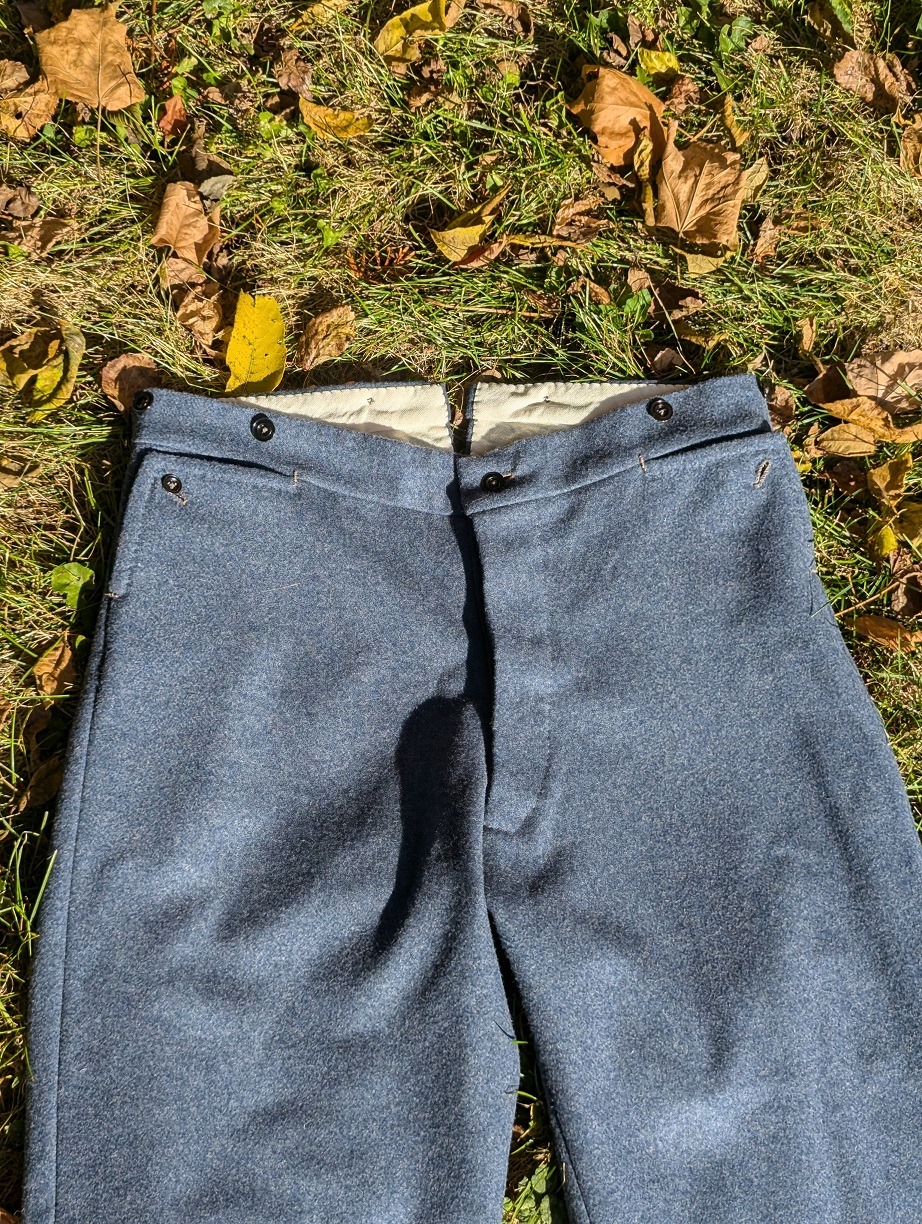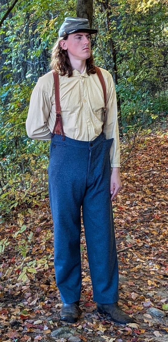 Based on surviving pairs that originated from the Clothing Bureau at Richmond, Virginia, these trousers are the quintessential eastern style worn throughout the war by the Army of Northern Virginia. Commonly made from “domestic” drab or vegetable-dyed jean and cassimere they were also provided to soldiers cut from imported English woolens such as blue-gray kersey. Our reproduction trousers will include various “maker's choice” details present among the extant six pairs of original Richmond Depot trousers. These include a closed, open, or tacked buttonhole fly; tacked or stay-stitched pocket openings; and slightly varying widths of the cuff. Finished trousers are offered here with Japan varnished tin, brown bone, or white bone buttons as availability permits. Each pair will also feature pointed pocket openings with buttons and buttonholes. Our custom production run of 2/2 twill blue-gray English kersey.is available for Richmond depot trousers as are a number of other jeans and cassimere we have in stock.